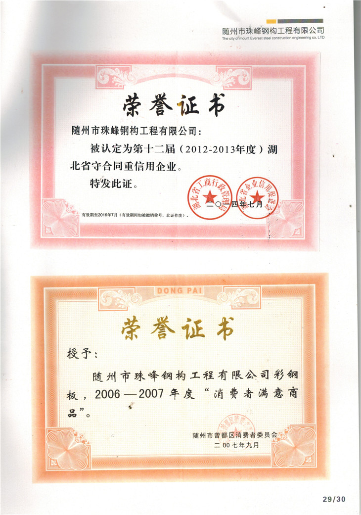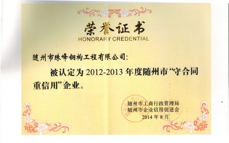 “守合同重信用”榮譽證書